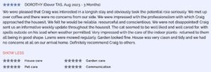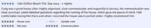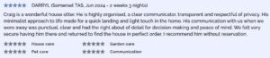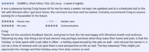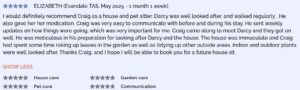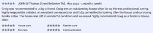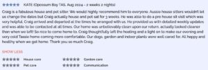 “From our initial meeting, and until our final communication, Craig has always been easy to deal with, and alway happy to answer any questions we had while we were away. We have no hesitation in recommending Craig to other Members of this website, as he has proven himself to professional, sincere, thorough, and fully vindicated to us other reviews left on this site. Our old Dog Austin has various medications that he needs, and Craig has followed them to the point, where our neighbours have commented how well he has looked while we were away. The house upon our return looked better than before we left, which left us feeling grateful that we had found such a wonderful person to look after our precious home. Once again Craig, thanks, p.s. we think the Aussie is missing you.”