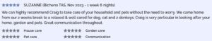“Craig has looked after our house and pets twice now. I have been able to take a proper break not worrying about how things are at home. I have every confidence that Craig has every situation covered. Craig is an excellent communicator and an absolute professional at this service. I can’t recommend him highly enough.”